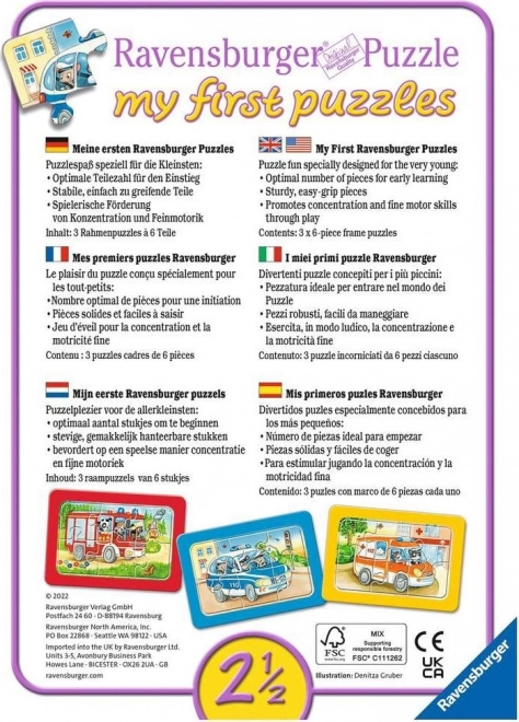 Descoperă bucuria primelor puzzle-uri cu aceste puzzle-uri pentru copii RAVENSBURGER. Setul conține trei imagini a câte șase piese, realizate din carton extra gros pentru mâinile micuților. Susțin motricitatea fină, concentrarea și imaginația și atrag prin drăguțele vehicule de intervenție cu animale la volan.