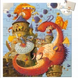 Puzzle cu motivul luptei dintre un cavaler și un dragon, într-o cutie frumos modelată.