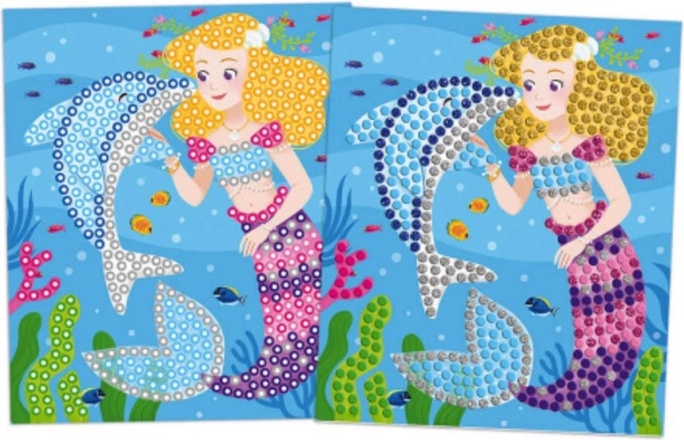 Set creativ pentru copii de la 5 ani, care dezvoltă motricitatea fină și imaginația. Conține 5 imagini frumoase cu zânele mării și delfini și 10 foi de autocolante sclipitoare și colorate pentru realizarea mozaicului. Lipire ușoară, motive pline de culoare și distracție de lungă durată acasă și în călătorii.