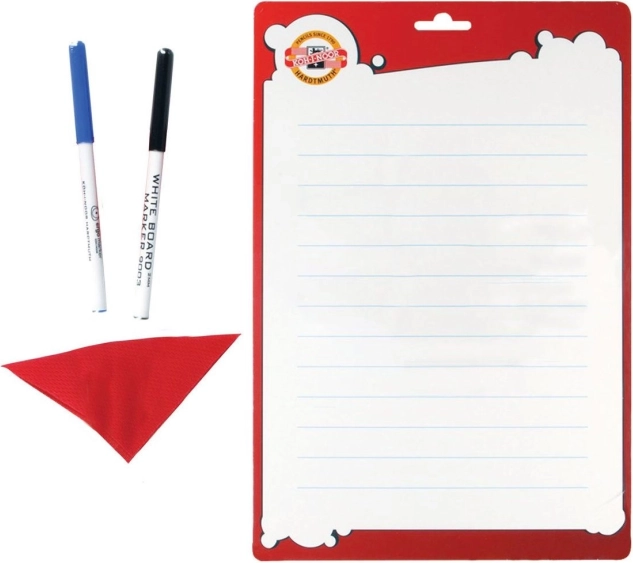 Descoperiți tabla de scris de la Koh-i-Noor, concepută pentru un antrenament eficient al scrisului. Datorită modelului de linii preimprimat, este ideală pentru învățarea proporțiilor corecte ale literelor manuscrise și tipărite. Pachetul include două markere în culorile negru și albastru și o cârpă pentru ștergerea ușoară a cernelii.