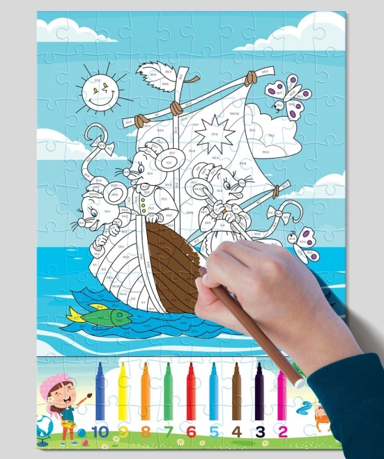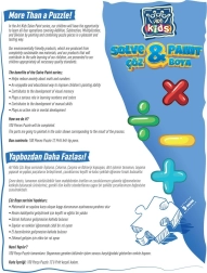 Acest produs este foarte prietenos cu mediul, deoarece este fabricat din materii prime complet sustenabile. Conținutul pachetului include 100 de piese de puzzle și 12 markere, care le permit copiilor să coloreze în funcție de rezultatele calculelor de pe fiecare piesă. Instrucțiunile sunt simple: potriviți piesele și, în funcție de rezultat, folosiți pe hartă culoarea cu numărul corespunzător.