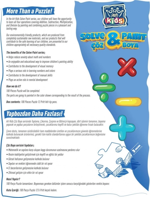 Puzzle-ul vizează învățarea principiilor matematice de bază, precum adunarea, scăderea, înmulțirea și împărțirea, contribuind la dezvoltarea abilităților matematice fără anxietate inutilă. Datorită coloratului și asamblării puzzle-ului, copiii își pot îmbunătăți îndemânarea manuală și pot dobândi o memorie vizuală mai bună.