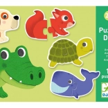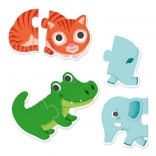 Djeco puzzle animăluțe 10x2 piese este primul puzzle ideal pentru copiii de la 2 ani. Fiecare animăluț este format din două piese mari, clare, colorate și ușor de îmbinat. Copiii își antrenează natural coordonarea mână–ochi și învață să recunoască diverse animăluțe.