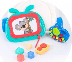 - tablă de desen cu stilou, mini pian/clape, „telefon”, roți dințate, forme de sortat