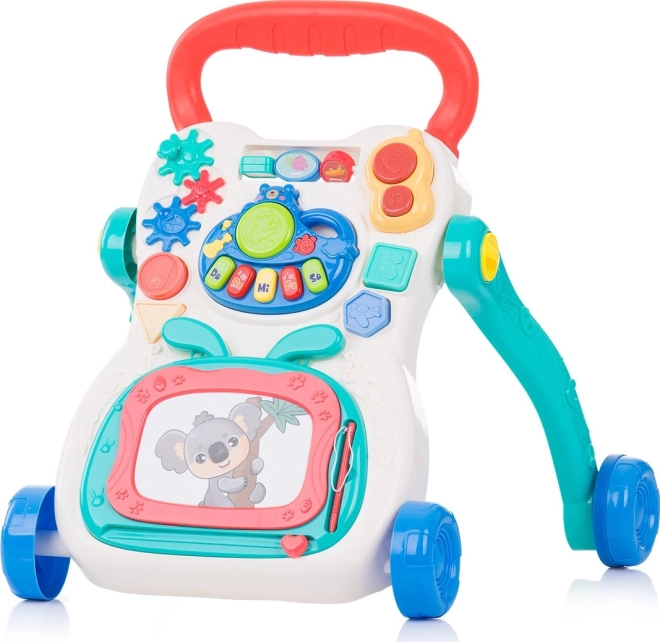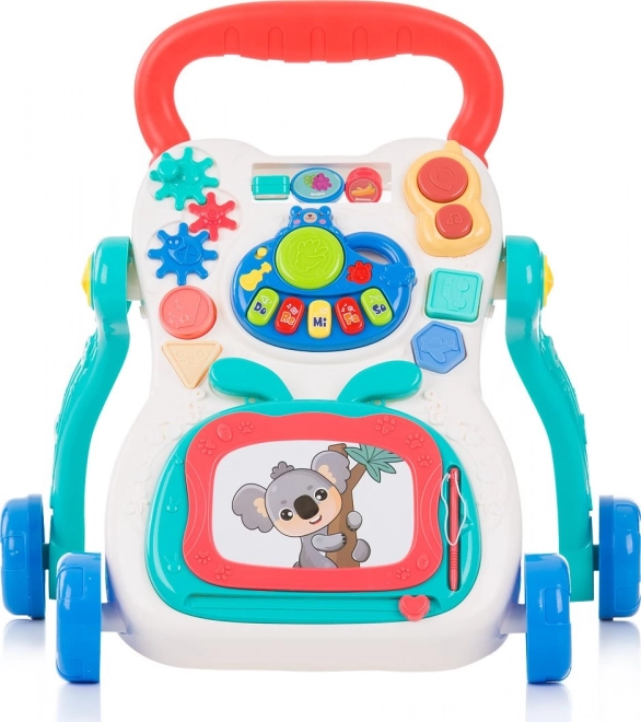 Premergătorul interactiv de împins este partenerul ideal pentru copiii care deja pot merge singuri și vor să descopere abilități noi. Datorită mânerului lat și roților stabile, ajută la creșterea siguranței în mers, în timp ce panoul de joc cu un motiv drăgălaș de koala oferă multă distracție – de la melodii și efecte luminoase până la desen și cântat la clape.