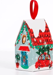 - Ambalat practic într-o cutiuță în formă de căsuță înzăpezită