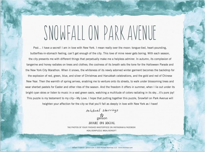 Bucurați-vă de atmosfera magică a iernii în New York cu puzzle-ul Ninsori pe Park Avenue de Michael Storrings, care conține 1000 de piese. Distracție ideală pentru serile lungi de iarnă, care nu doar dezvoltă logica, dar aduce și bucurie cu un produs fabricat sustenabil.