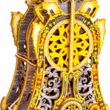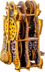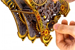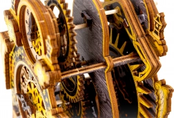 Modelul este realizat din placaj de mesteacăn ecologic și se asamblează fără adeziv sau unelte. În timpul montajului vei înțelege principiile angrenajelor, ale motorului cu benzi elastice și ale mecanismului unui ceas, de foarte aproape.
