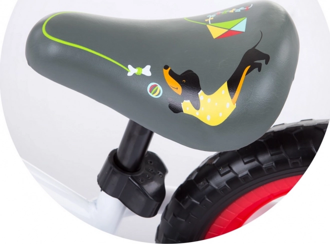 Roțile cu anvelope pline din spumă EVA nu necesită întreținere, atenuează foarte bine denivelările mici și sunt rezistente la pană. Șaua (aprox. 30–35 cm) și ghidonul (aprox. 57–62 cm) reglabile permit adaptarea la creșterea copilului.