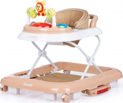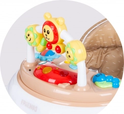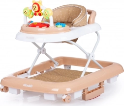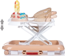 Pupitrul interactiv cu jucării colorate și panou muzical sprijină dezvoltarea simțurilor și a motricității fine. Scaunul poate fi reglat în 3 poziții pe înălțime, roțile din față se rotesc 360° pentru manevrare ușoară, iar întregul antemergător se pliază și se depozitează simplu.
