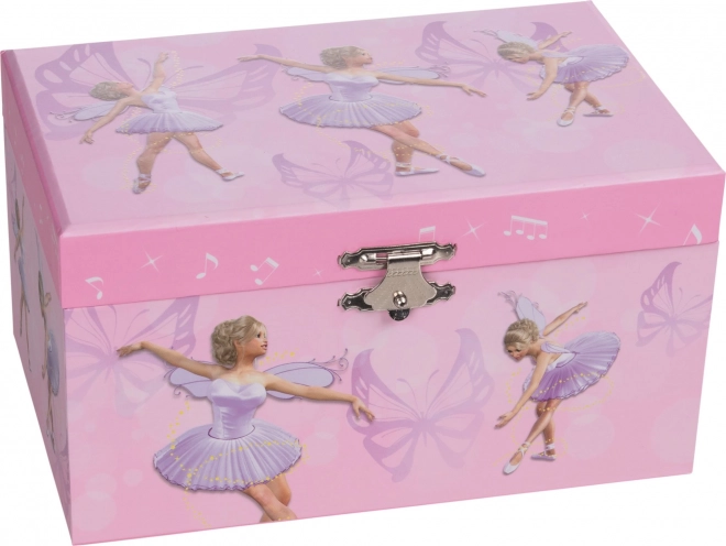 Această încântătoare cutie muzicală de bijuterii cu motiv de fluturi aduce în camera copilului o atmosferă poetică de balet. La deschidere se aude delicata melodie Lacul lebedelor, iar mica balerină începe să se rotească în fața oglinzii ei – locul perfect pentru păstrarea micilor comori și a primelor bijuterii.