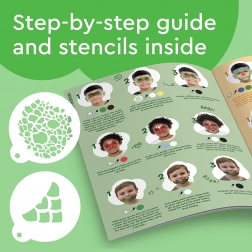 Setul conține 8 culori de calitate, șabloane pentru crearea ușoară a motivelor, bureți, pensulă și ghid cu imagini pentru începători și utilizatori experimentați. Se spală ușor cu apă și săpun, asigurând o îndepărtare ușoară.