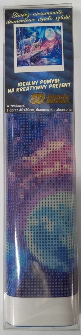 Descoperă farmecul picturii cu diamante și creează o imagine strălucitoare cu motivul lupilor la lună plină, în format 30 × 40 cm. Această activitate creativă aduce calm, concentrare și bucuria unei lucrări finalizate, pe care o poți ulterior înrama și expune (rama nu este inclusă în pachet).