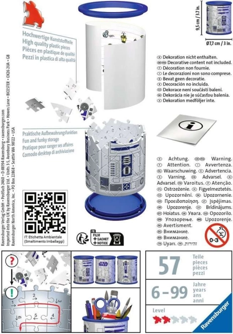 Nu mai căutați pixuri pe toată masa! Acest RAVENSBURGER 3D puzzle suport Star Wars reprezintă o modalitate practică și distractivă de organizare. Poate fi asamblat fie conform modelului pentru cei mai exigenți, fie după numerotarea de pe partea din spate a pieselor. Datorită pieselor speciale curbate din plastic de calitate, acest suport oferă nu doar un design frumos, ci și o stabilitate fermă fără a necesita lipire.