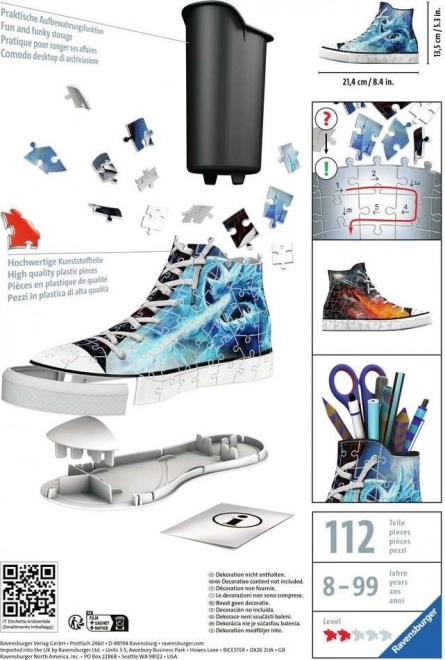 Acest puzzle 3D aduce o combinație genială pentru iubitorii de pantofi sport și colecționari. Poți crea un pantof sport cu imprimeu cosmic, care nu numai că va decora masa ta, dar va servi și ca organizator funcțional pentru pixuri, creioane colorate sau pensule.