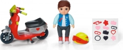 Descoperă aventuri urbane cu mini păpușa Simon și scuterul său stilat. Dimensiunea compactă de 7 cm se potrivește perfect mâinilor copiilor, iar scuterul roșu se manevrează ușor acasă și în deplasare. Setul stimulează jocul creativ și spunerea de povești.