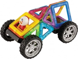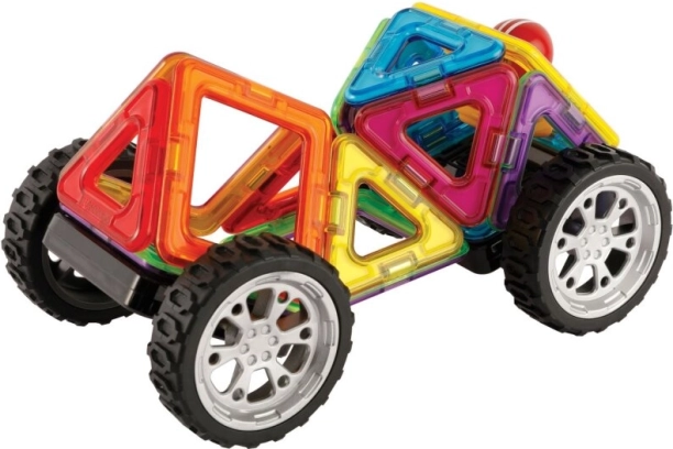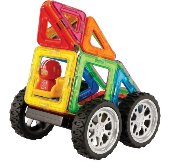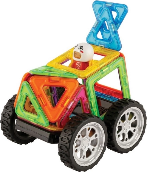 Surprinzător de multe posibilități din relativ puține piese. Construiește 30 de mașini diferite. Principalul avantaj al acestui set este reprezentat de cele 8 carduri model duble, din carton cretat rezistent, cu colțuri rotunjite. Pachetul conține un ghid ilustrat cu șabloane pentru 30 de mașini diferite. Ideal pentru copiii de la 3 la 6 ani pentru a se familiariza cu proprietățile didactice ale seturilor Magformers și ca o mostră a ceea ce se poate crea chiar și dintr-un număr relativ mic de piese. Posterele cu rețele plane și instrucțiuni de construcție sunt mari, piesele sunt reprezentate la scară reală, astfel încât copiii pot începe să construiască prin metoda aplicării foarte intuitive a pieselor reale direct pe foile-model. Număr de piese: 18 piese + ghid ilustrat + 19 carduri model duble: 5 pătrate 8 triunghiuri 1 pătrat cu leagăn 2 roți 1 figurină 1 cască de rezervă Setul creativ magnetic Magformers permite asamblarea unui număr mare de obiecte tridimensionale, folosind poligoane din plastic bidimensionale. Magformers dezvoltă motricitatea fină, stimulează creativitatea, îi învață pe copii culorile și formele geometrice de bază. Dimensiunile pieselor și formele alese adecvat asigură siguranța maximă posibilă a jucăriei. Materialul din care este realizat setul îndeplinește cele mai stricte criterii de igienă și sănătate. Piesele sunt suficient de mari pentru a nu putea fi înghițite și sunt practic indestructibile. MAGFORMERS se poate combina foarte bine și cu cunoscutul set magnetic Geomag.