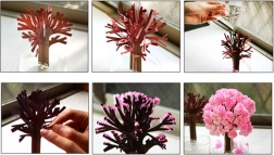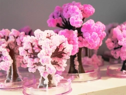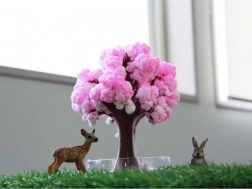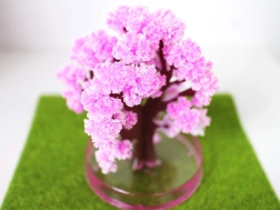 După udare, în câteva ore se formează cristale roz delicate care imită sakura în floare și transformă copăcelul simplu într-o decorațiune spectaculoasă.