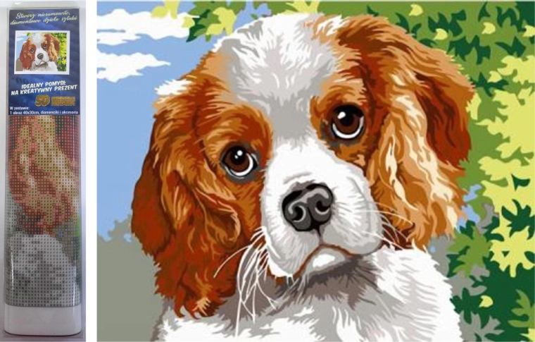 Instrucțiuni – Pictură cu diamante: Partea superioară a pânzei este acoperită cu adeziv și protejată cu o folie transparentă. Îndepărtați folia treptat, pe porțiuni, pe măsură ce aplicați pietricelele. Dacă îndepărtați întreaga folie deodată, stratul adeziv se poate murdări și pietricelele ar putea să nu adere la fel de bine. Pânza conține simboluri care sunt indicate în legenda anexată și corespund punguței cu pietricele marcată cu numărul respectiv. Vărsați pietricelele din punguța aleasă în tăviță. Încărcați vârful stiloului cu ceară, datorită căreia pietricelele se prind ușor de stilou. Aplicați pietricelele pe imagine cu stiloul. După ce ați lipit o anumită culoare, turnați pietricelele rămase înapoi în punguță și continuați cu următoarea culoare.