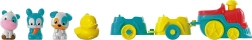 Când trenul merge, automat activează mișcarea la fermă, unde totul prinde viață și animalele scot sunete.