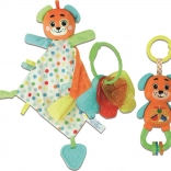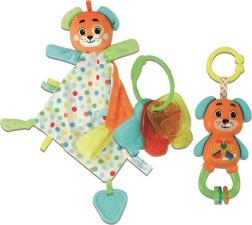 Acest set cadou de la BABY CLEMENTONI îmbină confortul, siguranța și distracția într-un singur pachet. Doudou-ul foarte moale din țesătură hipoalergenică absoarbe mirosurile și parfumul mamei, liniștind bebelușul în momentele de separare. Zornăitoarea colorată cu inele stimulează văzul și auzul, în timp ce jucăria de dentiție din silicon în formă de chei oferă alinare în perioada de erupție a dinților.