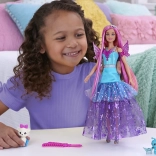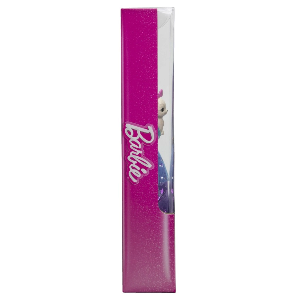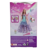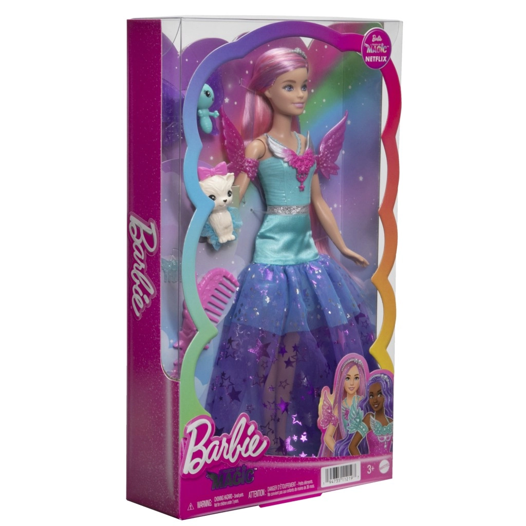 Păpușa Barbie Malibu din colecția „Barbie și o notă de magie” strălucește într-o rochie superbă cu tiul stelar, diademă sclipitoare și aripi detașabile. Părul roz pastel invită la pieptănat și styling, iar prietenii drăgălași – fluturașul și animăluțul cu tutu – dezvoltă imaginația și jocul de poveste.
