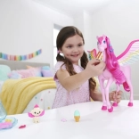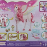 Lăsați-vă inspirat de lumea magică Barbie Touch of Magic și aventurați-vă în aventuri fantastice cu acest pegas roz. Acest pegas magic are douăzeci de accesorii diferite și funcții de lumini și sunete care sunt activate în diferite feluri.