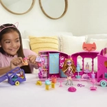 Acest magazin mobil roz‑mov, cu urechiușe de pisică adorabile, se transformă la deschidere într-un studio de modă stilat. Copiii vor găsi aici suporturi cu umerașe, manechine, o cabină de probă și o mulțime de accesorii tematice pentru o prezentare de modă perfectă. Păpușa pisicuță și prietenul ei devotat arată asortați și sunt pregătiți pentru orice aventură de modă.