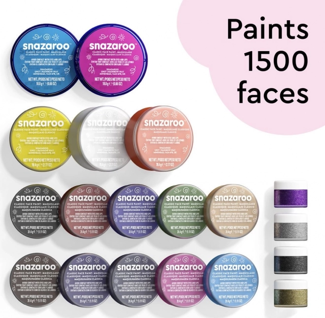 Set profesional pentru pictură pe față și corp SNAZAROO cu dotare bogată pentru școli, cluburi și evenimente mari. Oferă culori rezistente, luminoase și intense, care sunt sigure și netoxice, potrivite chiar și pentru pielea sensibilă. Se spală ușor cu apă și săpun și ajung pentru cel puțin 1500 de fețe.