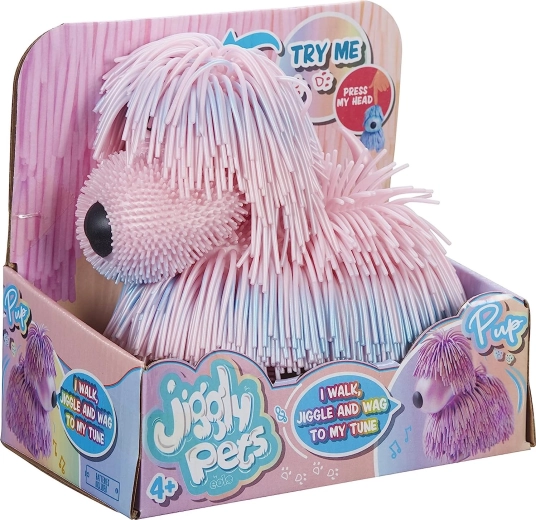 Căţelul interactiv JIGGLY PETS aduce copiilor multă voie bună și mișcare. Doar apasă butonul de pe cap și cățelul pornește, se foiește și însoțește totul cu lătrat vesel și melodii. Suprafața sa moale, cu franjuri, invită la atingere și susține stimularea senzorială.