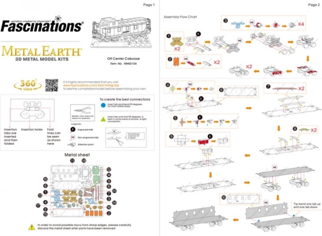 Scoateți piesele individuale din foile metalice; dacă este necesar, folosiți un clește tăietor mic (neinclus). Piesele se conectează între ele cu ajutorul încuietorilor formate din cârlige (lăbuțe) și orificii. Îndoiți lăbuța cu ajutorul unui clește subțire mic (neinclus) și îmbinați treptat toate încuietorile până când rezultă o piesă de măiestrie foarte realistă!