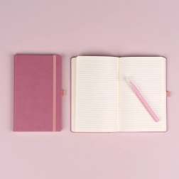 Caiet dictando stilat, în culoare roz, cu textură textilă fină, oferă legătură tip carte solidă, buclă pentru pix, bandă elastică și semn de carte textil. Ideal pentru scrisul zilnic datorită linilor de 6 mm pe hârtie galbenă de calitate.