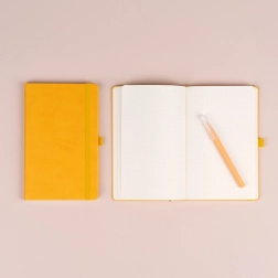 Notes practic și ușor, cu puncte, în culoare galbenă la modă, are o suprafață cu textură fină pe care puteți aplica logo-ul companiei. Notesul are legătură tip carte și colțuri rotunjite, suport pentru stilou, elastic și semn de carte textil. Punctele au 5 mm și sunt pe hârtie galbenă de calitate.
