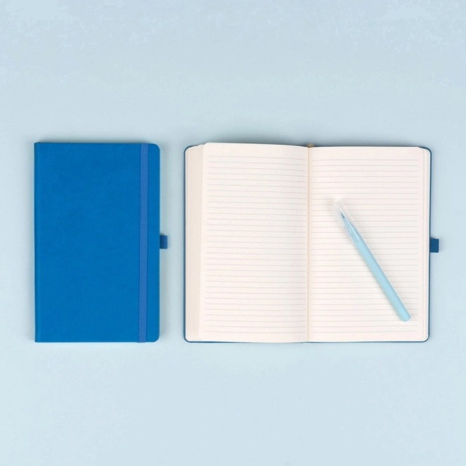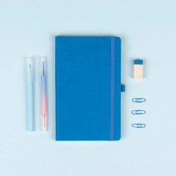 Caietul albastru, practic și ușor, cu textură mai aspră a copertei, este ideal pentru notițe, planificare și însemnări zilnice. Datorită legăturii tip carte și benzii elastice, conținutul rămâne mereu protejat, în timp ce bucla pentru pix și semnul de carte textil cresc confortul la utilizare.
