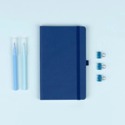 Caiet dictando elegant, în culoare bleumarin, cu legătură tip carte, ideal pentru notițe zilnice și utilizare profesională. Oferă bandă elastică practică, buclă pentru stilou, semn de carte textil și hârtie galbenă de calitate cu dictando de 6 mm. Datorită suprafeței rezistente cu textură mai aspră, este potrivit și pentru ștanțarea în relief a logo‑ului companiei.
