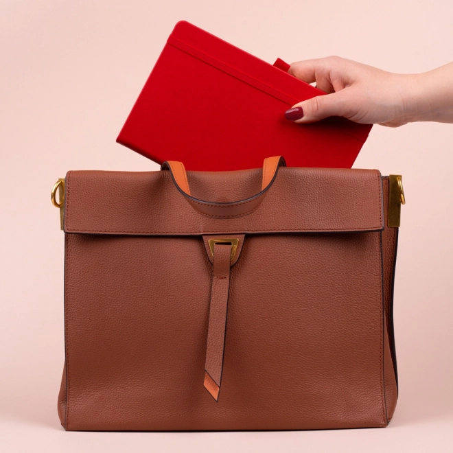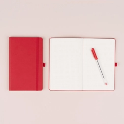 Caiet elegant cu puncte, în culoare roșie, cu legătură tip carte și accesorii practice, ideal pentru planificare, schițe și bullet journal. Oferă hârtie galbenă cu puncte de 5 mm, buclă pentru stilou, bandă elastică și semn de carte textil. Suprafața cu textură mai aspră permite ștanțarea în relief a logo-ului, fiind excelent și ca obiect promoțional de firmă.