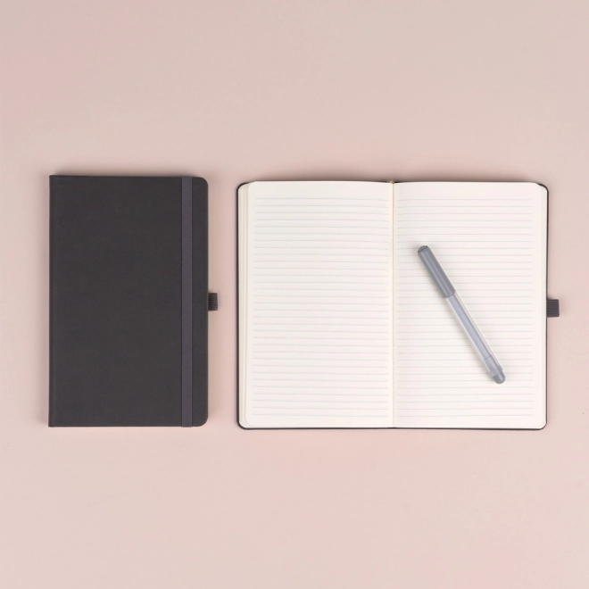 Banda elastică menține caietul închis în siguranță, semnul de carte textil accelerează orientarea, iar bucla pentru stilou asigură că instrumentul de scris este mereu la îndemână.