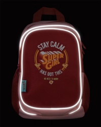 Motivul SUPER GIRL îi încântă pe copii, în timp ce buzunarele laterale din plasă păstrează sticla sau mărunțișurile mereu la îndemână. Buzunarul frontal cu fermoar oferă acces rapid.