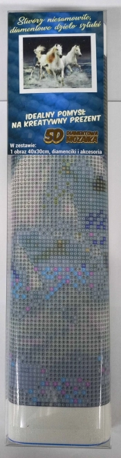 Pictura cu diamante este o activitate creativă ușoară și distractivă, în care, cu ajutorul unui stilou de aplicare, lipești mici pietricele pe o pânză pretipărită. Motivul cu armăsari albi în galop se evidențiază prin efectul sclipitor și devine o podoabă pentru orice interior. Nu ai nevoie de abilități artistice – este suficient să urmezi legenda.