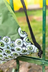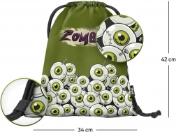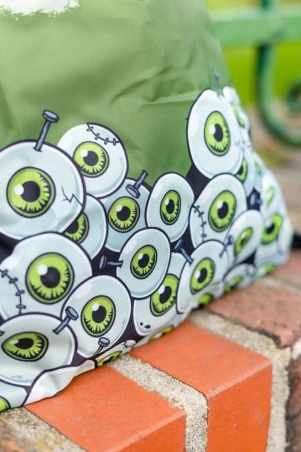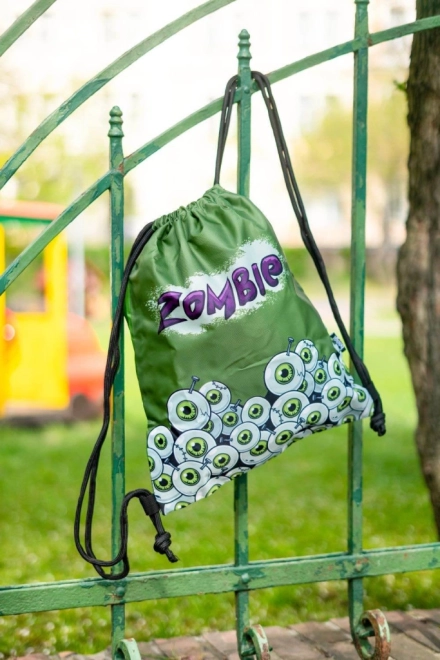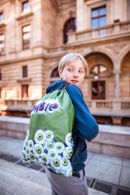 Rucsacul este acoperit cu grafică de ochi verzi desenați și inscripția 'Zombie', atrăgând atenția și adăugând un plus de personalitate.