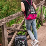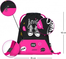 Combinația de culori negru-roz, cu motive jucăușe precum teniși și inscripții precum „love” și „xoxo”, transformă acest săculeț într-un accesoriu la modă.
