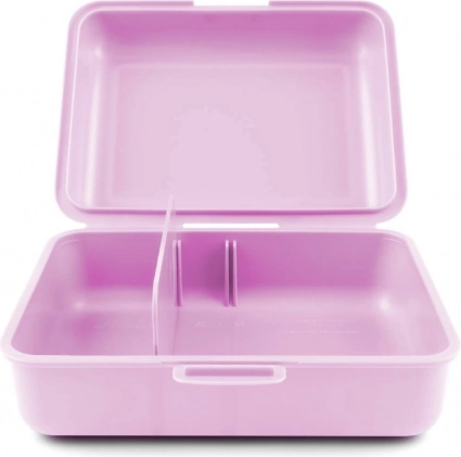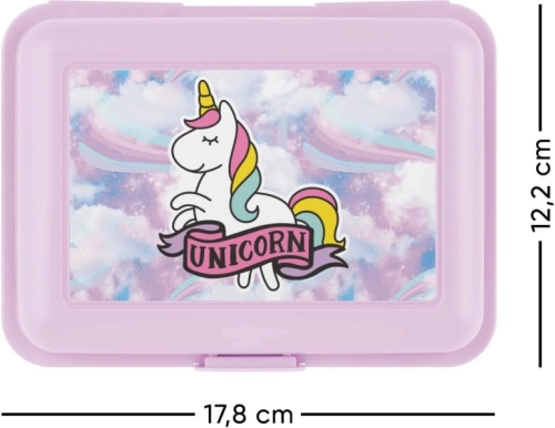 Drăguța cutie pentru gustare cu motiv de unicorn va încânta orice copil. Oferă închidere practică cu o singură clapetă, perete despărțitor interior pentru o mai bună organizare și execuție din plastic rezistent, ideală pentru școală și excursii.