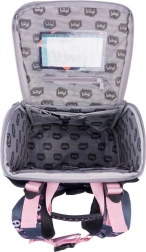 Sistemul de deschidere rabatabilă oferă acces la conținut direct de pe bancă. În interior găsiți un organizator cu elastic, un buzunar transparent pentru orar și suficient spațiu pentru manuale și gustare.