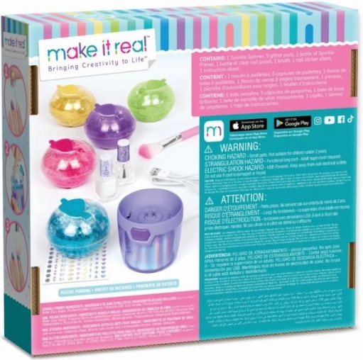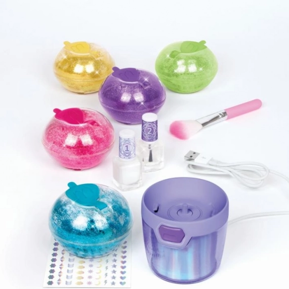 Setul conține cinci tipuri de sclipici, un spinner pentru amestecare, lac de bază, lac transparent, pensule și autocolante care permit un design personalizat al unghiilor.