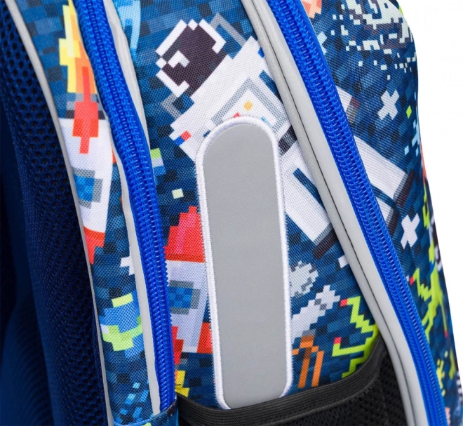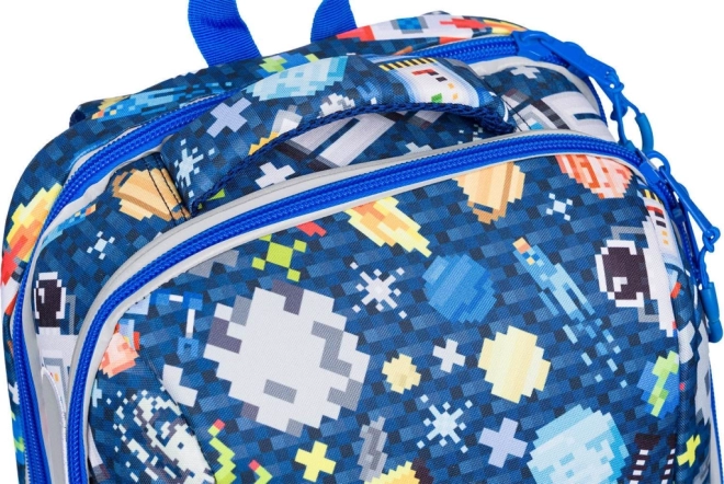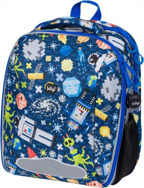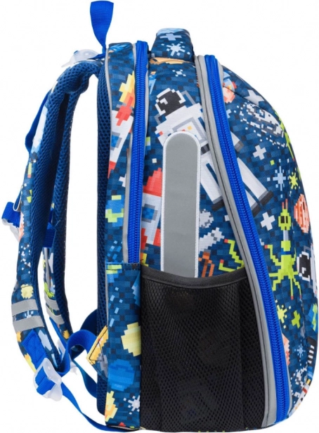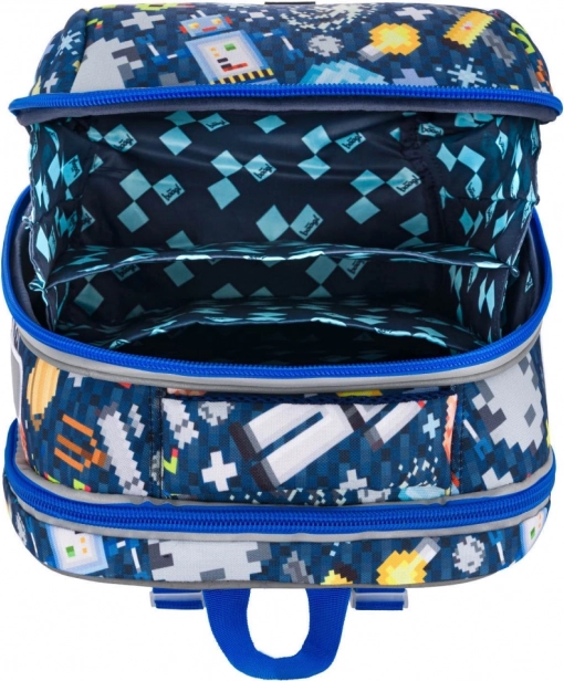 Ghiozdanul cu motiv spațial pixel-art îi va încânta pe micii gameri și exploratori. Corpul rigid întărit funcționează ca un scut care protejează toate rechizitele școlare. Două compartimente principale cu organizator inteligent, buzunărel pentru mărunțiș/telefon și carabină pentru chei ajută la menținerea ordinii perfecte și la distribuirea uniformă a greutății.