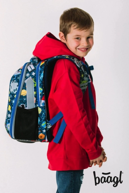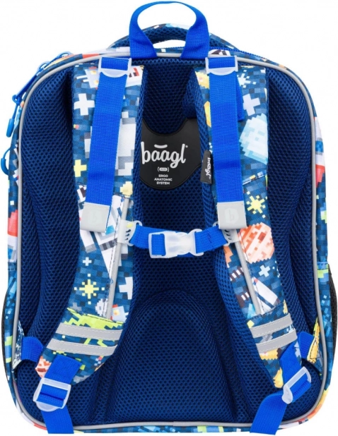 Ghiozdanul școlar BAAGL SHELLY Space Game, ușor și rezistent, este ideal pentru clasele 1–4. Oferă o construcție rigidă tip carcasă, sistem cu două compartimente, spate ergonomic și elemente reflectorizante numeroase pentru siguranță maximă. Datorită sistemului reglabil de spate AIR ERGO ADJUSTABLE, greutății reduse de 1 000 g și volumului de 23 l, poartă confortabil tot ce este necesar la școală.