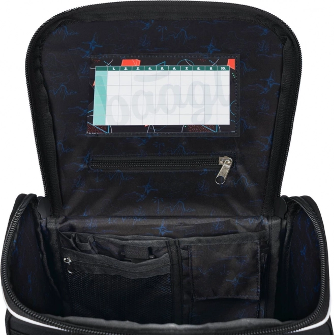 • În interior se află un buzunar transparent cu orar și un organizator intern care permite distribuirea uniformă a greutății, completat cu un elastic de fixare.