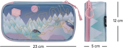 Penarul Baagl Skate Moon se remarcă prin designul modern cu motiv de munți și planetă în combinație albastru-roz. Datorită fermoarului solid și materialului rezistent, îți protejează în siguranță instrumentele de scris și micile accesorii școlare.