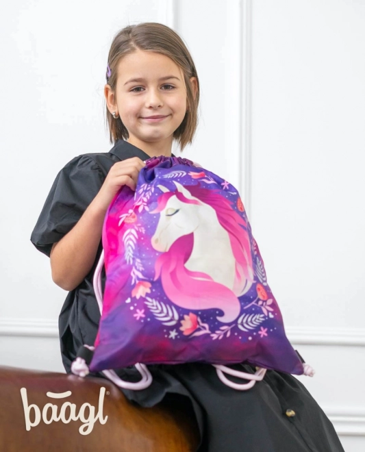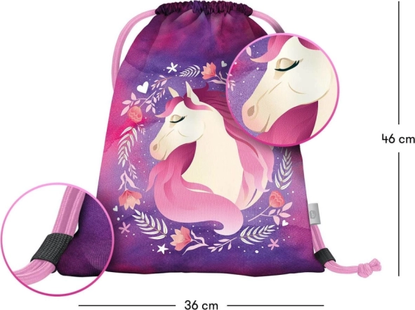 Un design stilat cu motiv de cai și flori care va cuceri nu numai copiii. Săculețul este ideal pentru a purta lucruri mici.