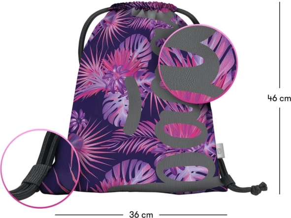 Sacul are un motiv tropical atrăgător în tonuri roz și mov, care atrag atenția.
